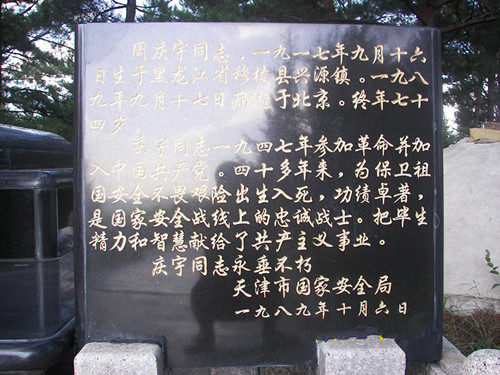 周庆宇同志,一九一七年九月十六日生于黑龙江省穆棱县兴源镇。一九八九年九月十七日病逝于北京。终年七十四岁。周庆宇同志一九四七年参加革命并加入中国共产党。四十多年来为保卫祖国安全,不畏艰险,出生入死,功绩卓著,是国家安全战线上的忠诚战士,把毕生精力和智慧献给了共产主义事业。