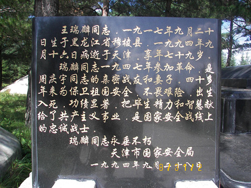 王瑞麟同志,一九一七年九月二十日生于黑龙江省穆棱县,一九九四年九月十六日病逝于天津,享年七十九岁。瑞麟同志一九四七年参加革命,是周庆宇同志的亲密战友和妻子,四十多年来为保卫祖国安全,不畏艰险,出生入死,功绩显著,把毕生精力和智慧献给了共产主义事业,是国家安全战线上的忠诚战士。